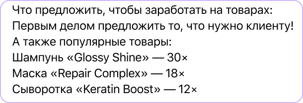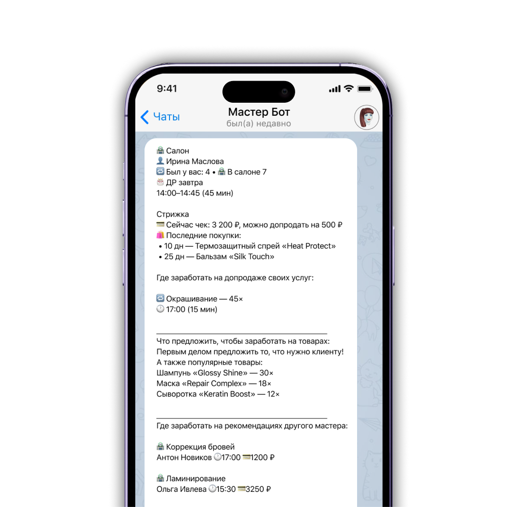 «Бот реально помогает мастерам продавать больше, но без давления на клиента. Рекомендации выглядят как забота, а не как продажи»
